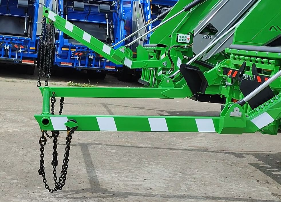 Механизм опрокидывания позволяет работать со всеми типами контейнеров по EN840-2 и EN 840-2.3,4 - DIN 30700.Специальное оборудование, которое включает в себя кузов с выгружающей плитой, задний борт с прессующим механизмом, устройство для выгрузки контейнеров, механизм подъёма бункеров, гидравлической системы, автоматического управления прессующим механизмом превосходит характеристики импортных машин,что позволяет машине занять достойное место по эффективности среди городских мусоровозов. Два варианта управления механизмом прессования: автоматический (САУ) или гидроавтоматический.